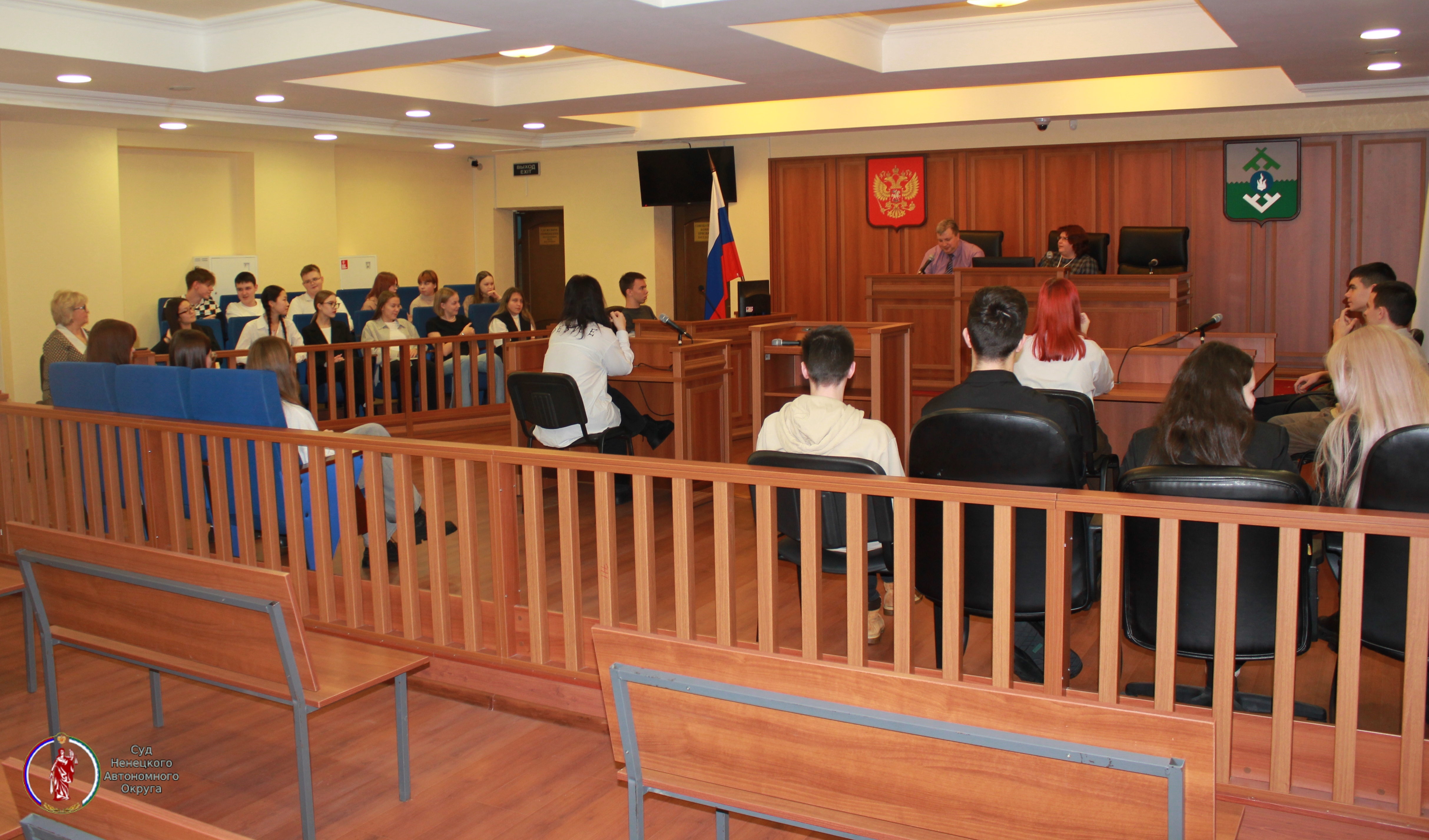 При входе в здание суда округа гостей встретили судебные приставы, которые ознакомили ребят с процедурой пропускного режима. Председатель судебной коллегии по гражданским делам суда округа, председатель квалификационной коллегии судей Ненецкого автономного округа Светлана Гомола провела для десятиклассников средней школы № 1 г. Нарьян-Мара обзорную экскурсию по зданию суда, в ходе которой дети побывали в залах судебных заседаний, где рассмотрение уголовных дел осуществляется с участием присяжных заседателей, а также с использованием видеоконференц-связи, конференц-зале и в учебном классе. Светлана Гомола познакомила учащихся с историей образования суда, с судебной системой, символами судебной власти, рассказала о порядке проведения судебных заседаний. Разговор с судьей получился насыщенным и познавательным, ребята активно обсуждали темы, задавали вопросы.