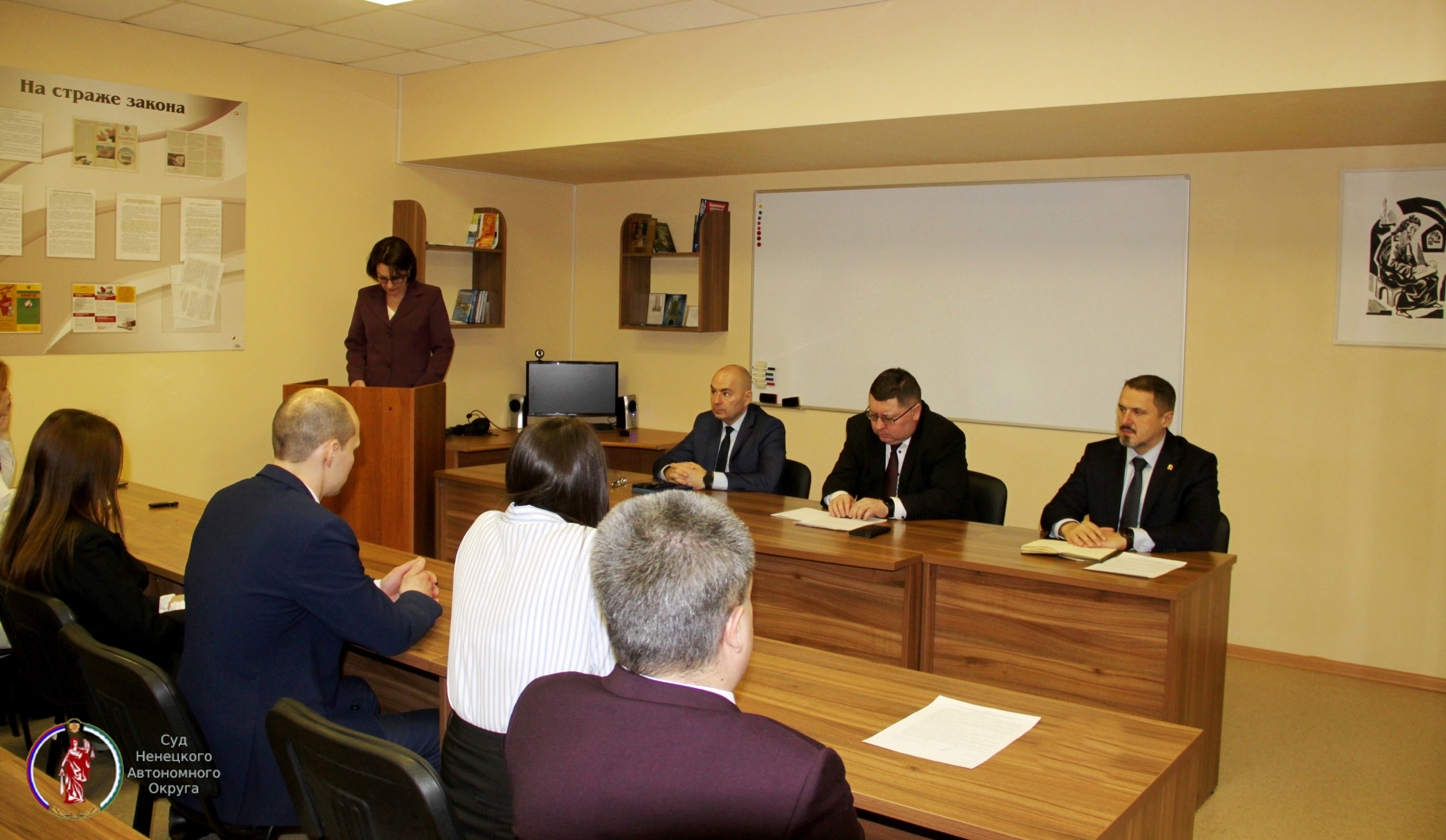 В суде Ненецкого автономного округа состоялось итоговое годовое совещание, в котором приняли участие председатель суда округа Александр Лисицын, заместитель председателя суда округа, председатель судебной коллегии по уголовным делам суда Ненецкого автономного округа Александр Карманов, руководитель аппарата - администратор суда округа Сергей Евсеев, а также государственные гражданские служащие и персонал суда Ненецкого автономного округа.