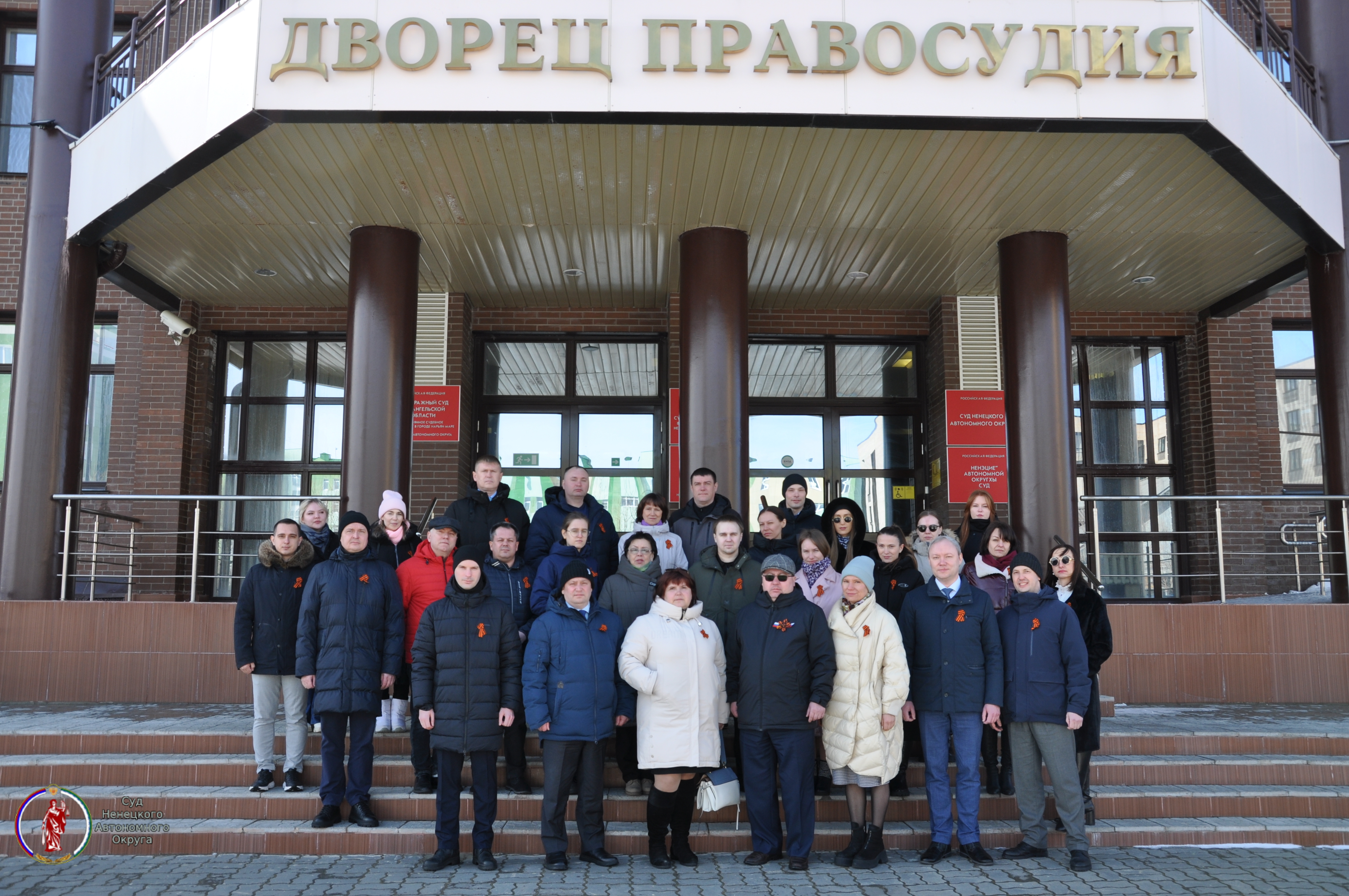 9 мая 2025 года Россия отпразднует 80-летний юбилей Победы в Великой Отечественной войне. Георгиевская лента является неотъемлемым атрибутом великого праздника — Дня Победы. Георгиевская лента – символ Победы, воплощение воинской доблести и славы, цвета которой обозначают дым и пламя. Основная цель мероприятия — сохранить память о воинах, погибших при защите Отечества. Главный слоган акции — «Я помню! Я горжусь! Судьи и аппарат суда Ненецкого автономного округа присоединились к акции «Георгиевская лента», прикрепив ее на груди, на уровне сердца. Тем самым коллектив суда округа выражает уважение всем живым и ушедшим ветеранам Великой Отечественной войны и труженикам тыла.